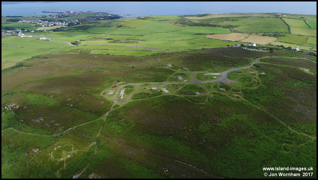 Another general view of Mull Hill, with the stone circle bottom left. Port St Mary in the distance.