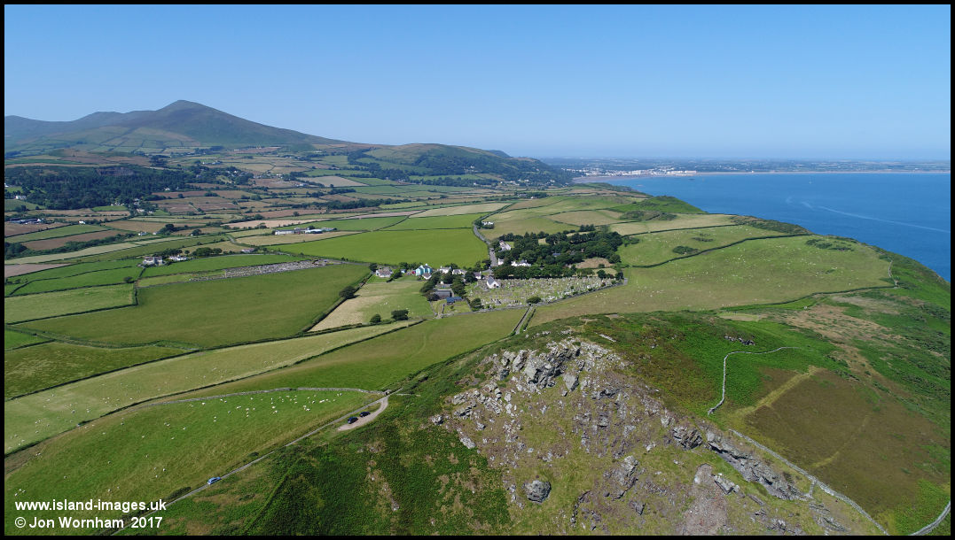 Maughold Head and village, with Ramsey in the distance and North Barrule as backdrop