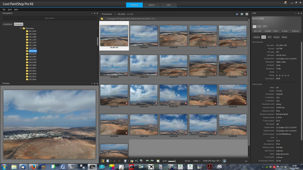 These are the 21 original pictures shot automatically by the DJI Spark for one of the panoramas. All that is needed now is to stitch them together in PTGui, edit and re-size for the web page.