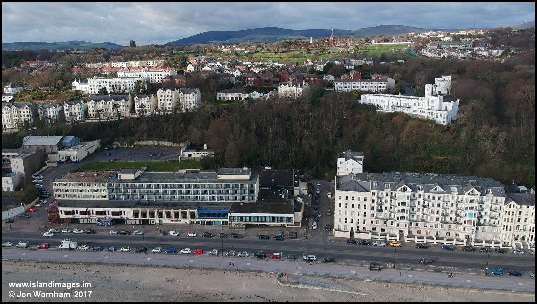 The former Falcon Cliff Hotel, now offices, standing above the rather ugly Hilton Hotel with Nobles Park beyond. At one time a cliff lift (actually still in situ, hidden in the trees) linked the Falcon Cliff with the promenade