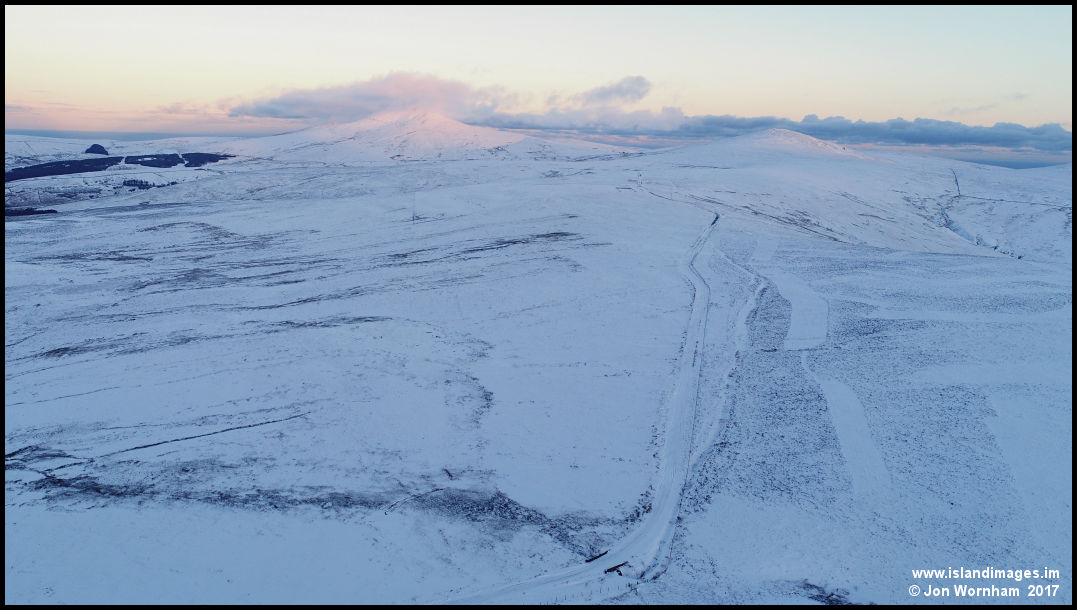 A snow covered Brandywell Road runs through this picture, with the sun setting on a cloud covered Snaefell summit.