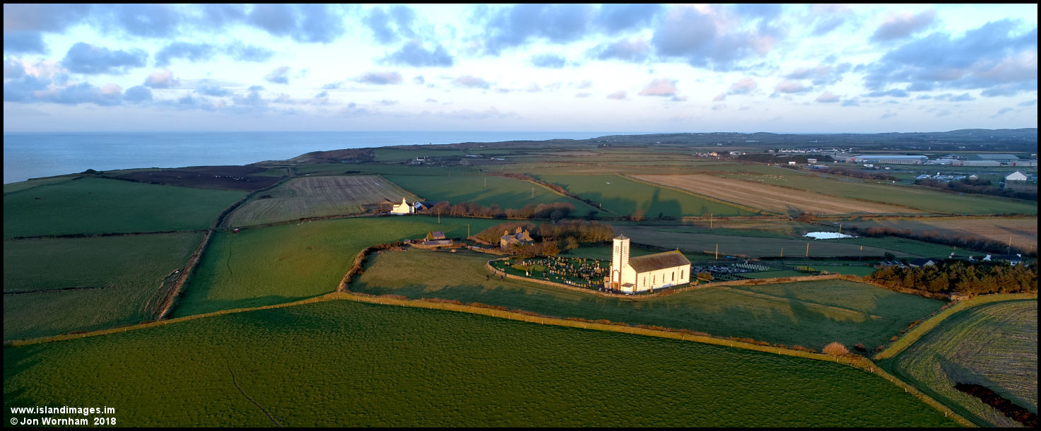 The setting sun illuminates Jurby Church