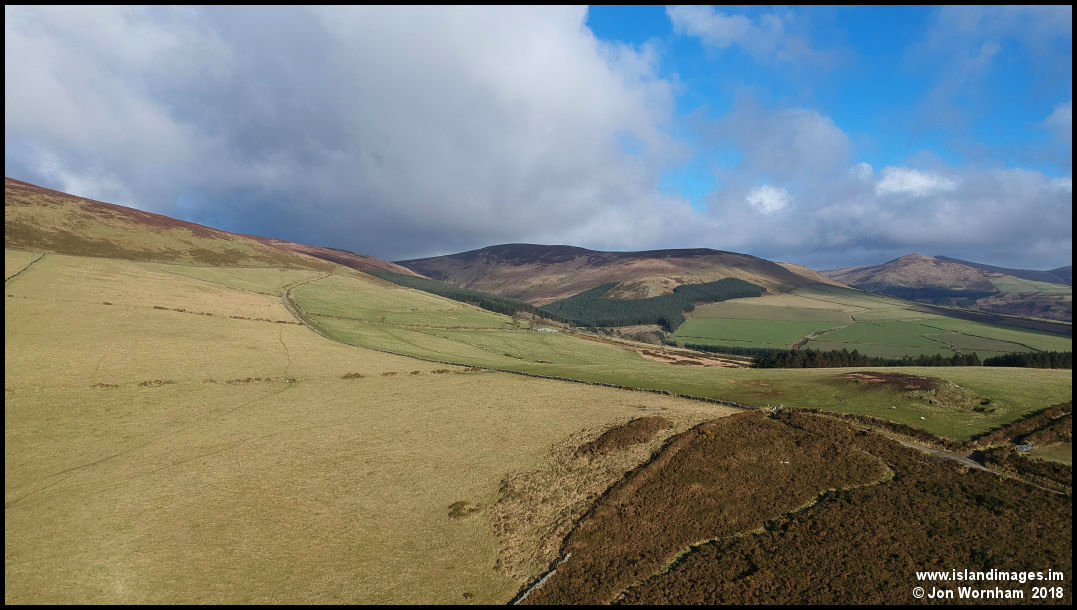 Looking across Cronk Breck as a green lane winds up into the hills by Slieau Ruy