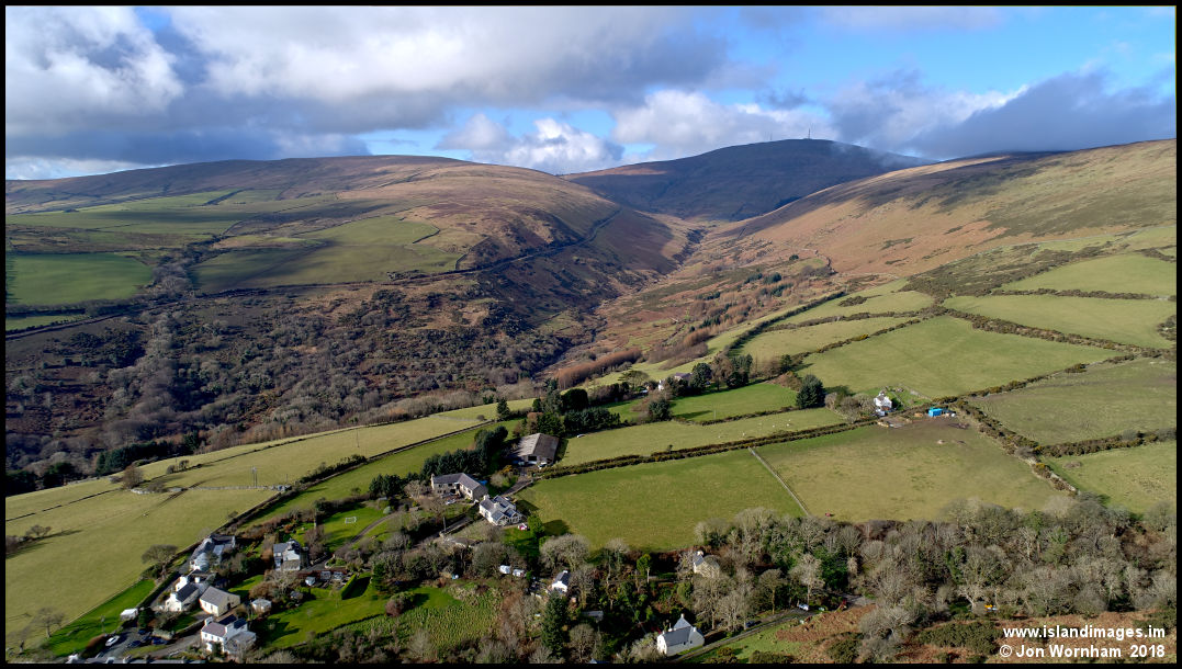 The outskirts of Agneash, looking along Laxey Glen to Snaefell.
