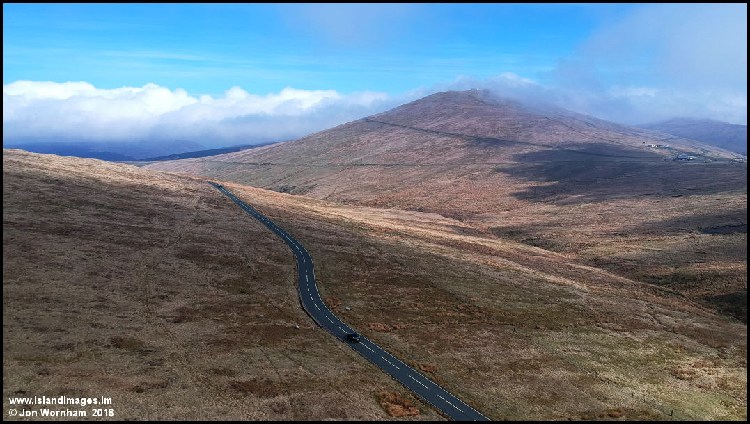 Looking west along the Brandywell Road, with cloud covering the summit of Snaefell