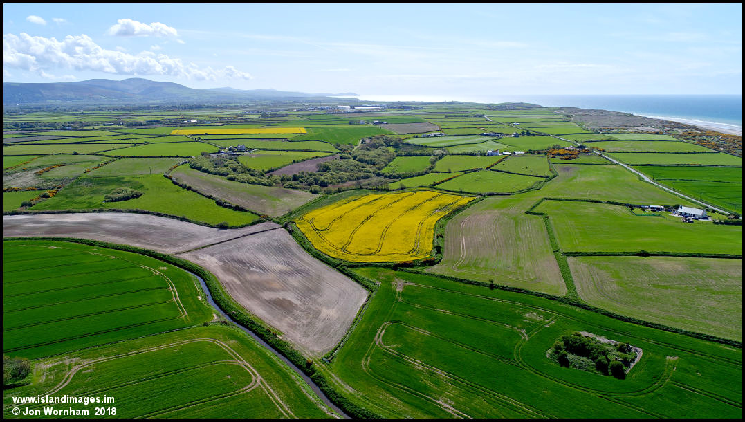 Looking south west in this view with the Lhen river running across the picture and Peel Hill just visible in the far distance.