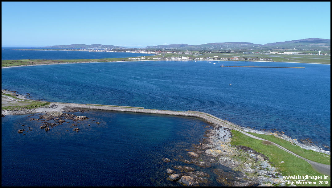 The causeway linking St Michael's Island with Langness. Ronaldsway Airport is visible on the top right of the picture, showing why co-ordination with Air Traffic Control was essential here.