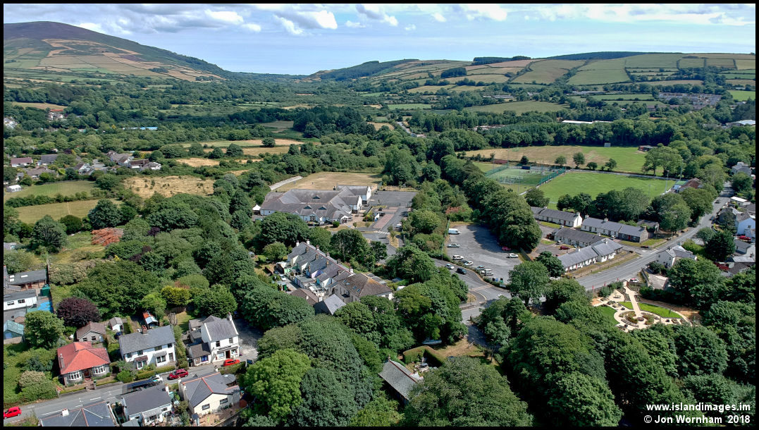 The former Manx Northern Railway station building still exists as a private residence and its roof can be seen ottom centre. The Isle of Man Railway station has long gone but was where the car park can be seen here.