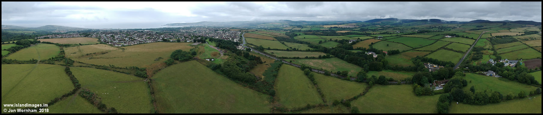 Panorama centred on the Onchan Centenary Park, showing from Molly Quirk's Glen on the left round to the Mountain Road on the right. Click image for larger scrollable version and again to return.