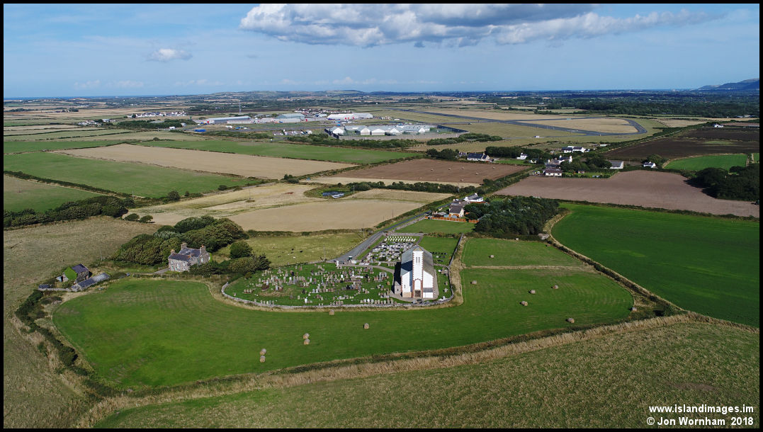Jurby Church, with Jurby airfield in the background. The airfield was constructed in the late 1930s as an RAF training base and can still be used by aircraft, alrhough is more commonly used for motorsport now.