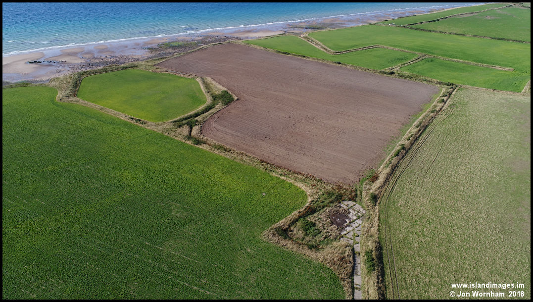 The Jurby Head gunnery range.  Used for training WW2 air gunners, a target would move on rails around the outside of the protective wall and gunners would fire at it from replica turrets located on the land side of the structure.