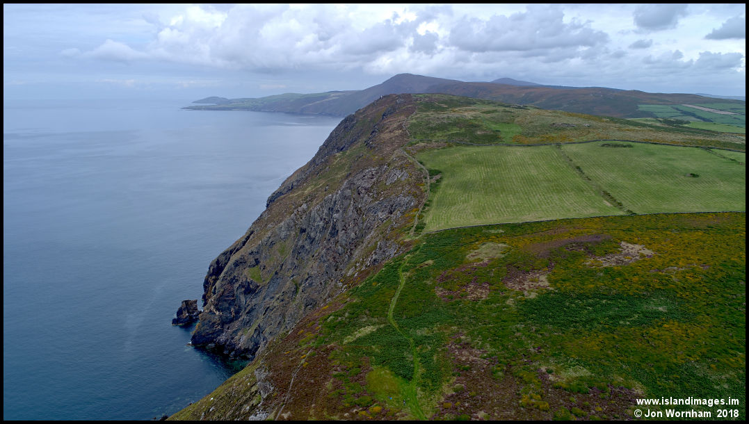 Looking north along the coastline to Bradda Hill, with Niarbyl and Peel Hill in the distance.