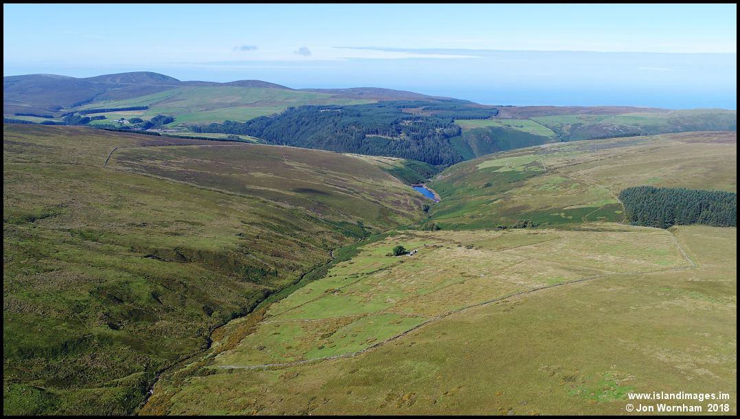 The Tholtan of Block Eary farm with home field patterns still visible. Block Eary reservoir and Sulby Glen behind.