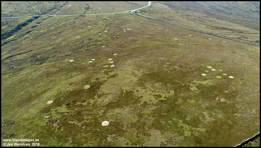 Interesting circles on grazing land at the top of Glen Auldyn. I think that they may be formed where the local farmer has placed winter feed for the sheep. Mountain Box top centre of the picture.