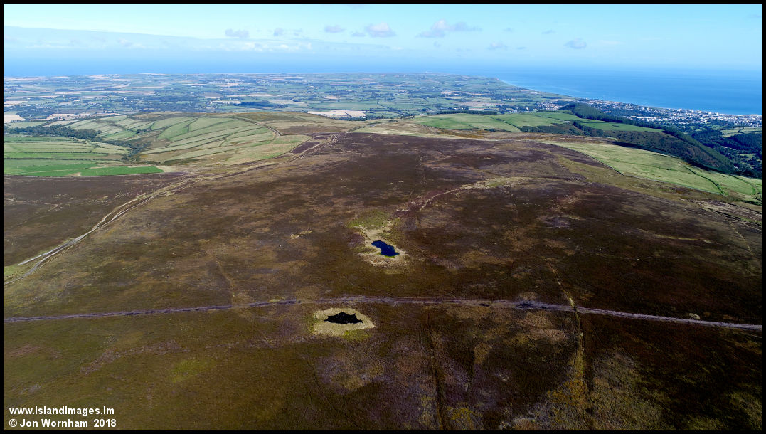 Hilltop ponds on the watershed between two valleys, Glen Auldyn to the right.