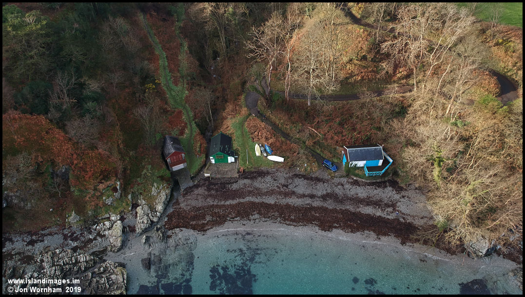 A near vertical view of the beach and boathouses at Garwick.