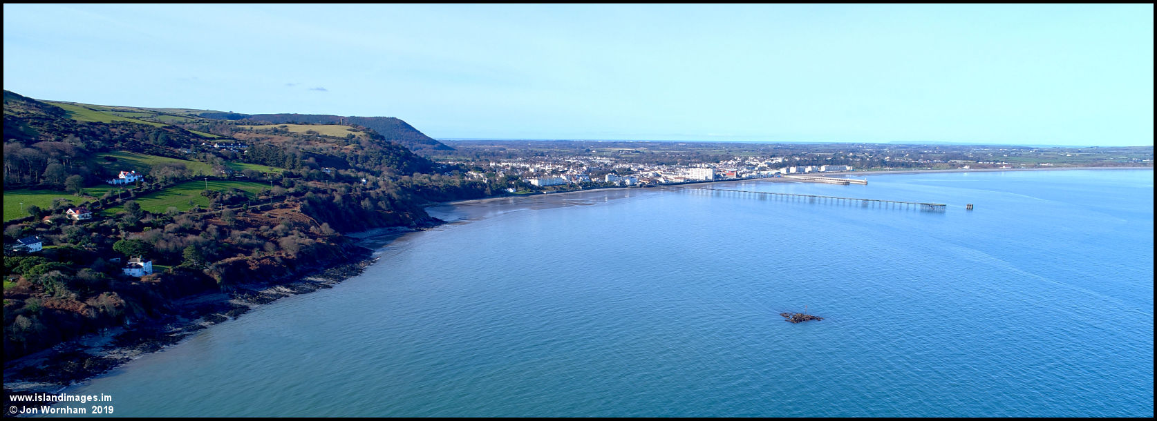 The Carrick rock, Queen's Pier and Ramsey, from offshore at Port Lewaigue.