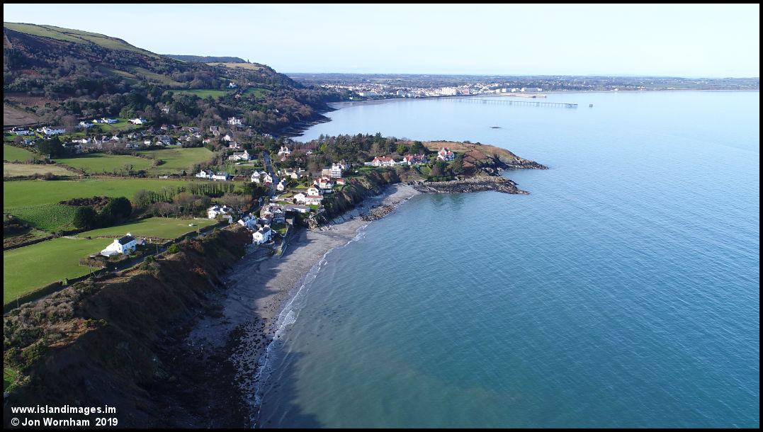 Moving the flying location to Port e Vullen beach and looking over the beach and Gob ny Rona, with Ramsey and the pier in the distance.