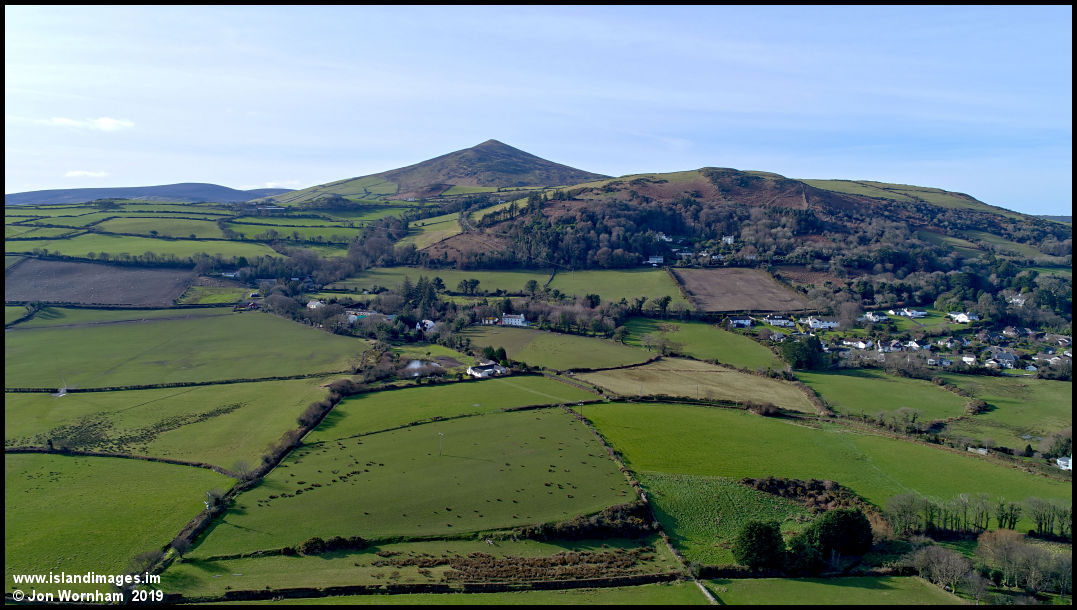 Looking inland from Port e Vullen, across the fields with North Barrule rising above the surrounding lands.
