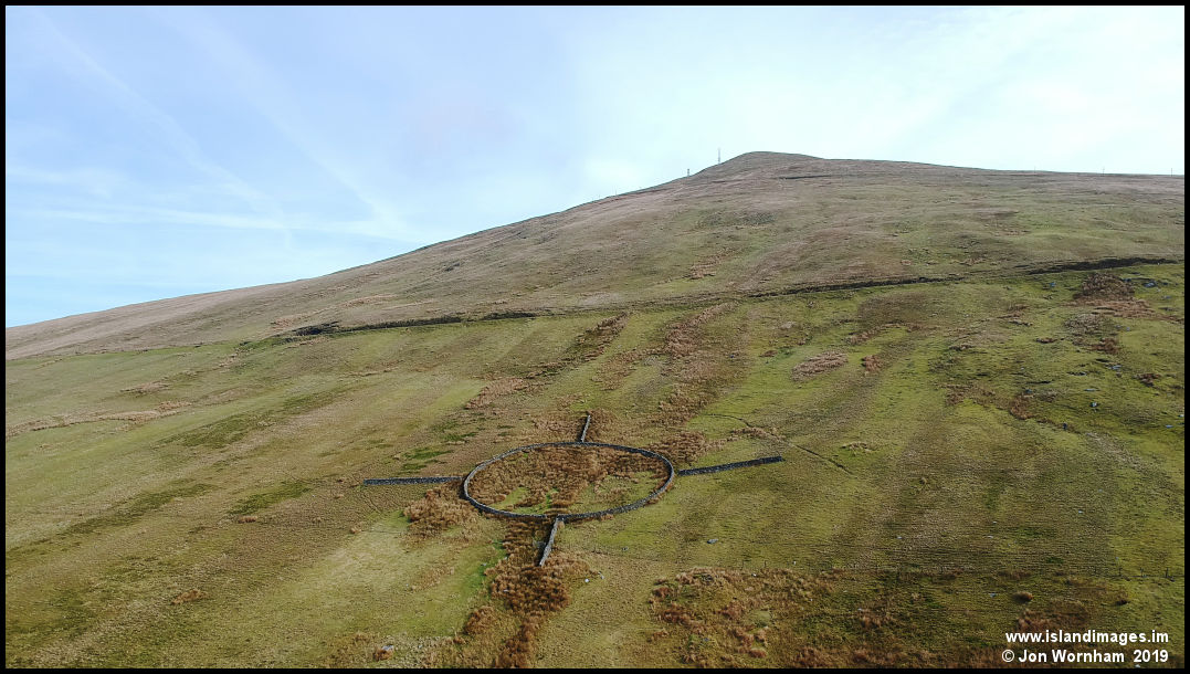Looking past the sheepfold and up the slopes of Snaefell, the horizontal line is where the Tholt-y-Will road runs.