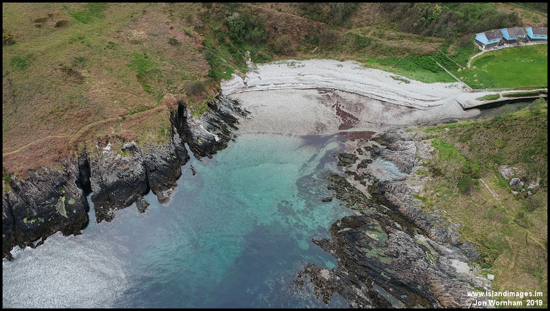 A near vertical view of the stoney beach and clear sea water at Groudle.