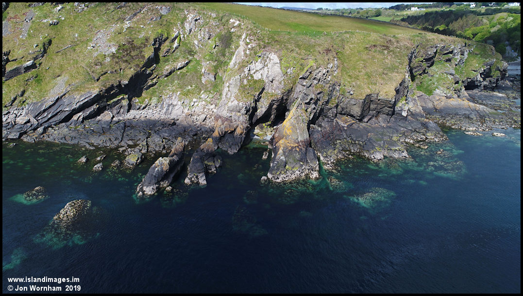 A more vertical view on the area from around cliff top height. Port Soderick beach is just out of shot on the right of the picture.