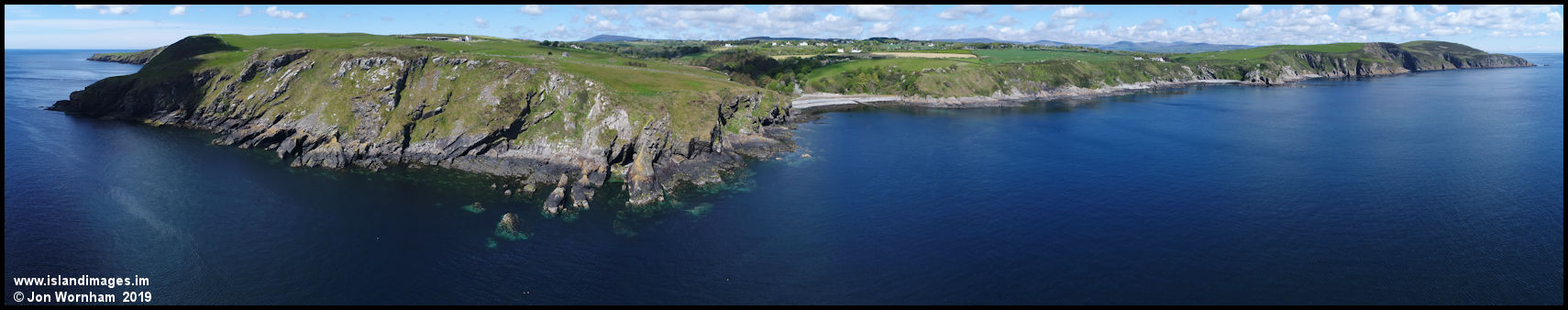 A multi shot panorama centred on the southern headland at Port Soderick.