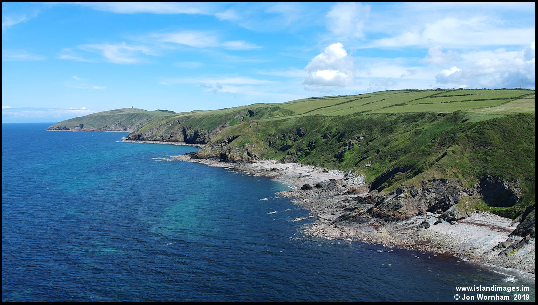 Looking along the coastline from the north end of Glen Maye beach to Peel Hill.