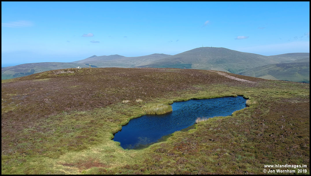 A lower level view of the hilltop pond, looking towards Snaefell and North Barrule.
