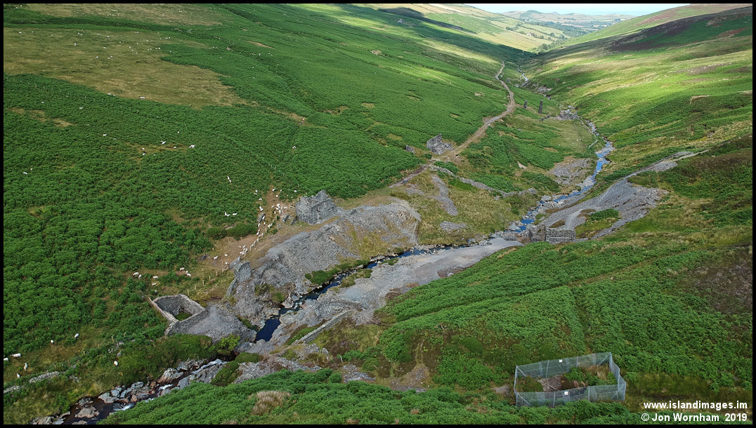 The North Laxey Mine, with the two shafts showing up well in this picture. A long drive rod connected the water wheel further down the valley to the pumps in the north shaft.