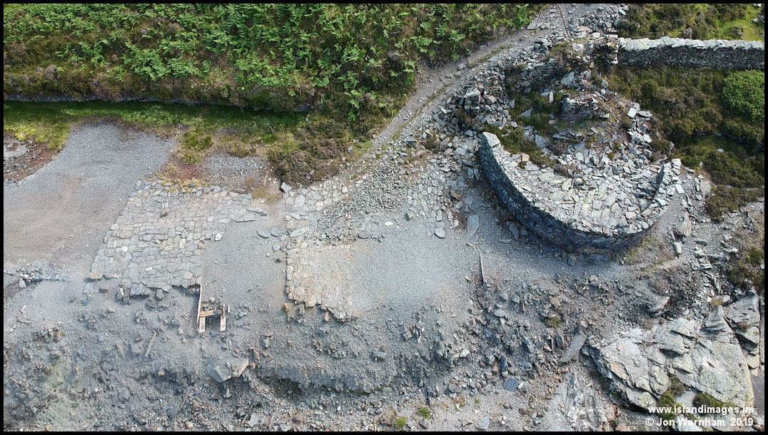 Vertical view of the ore processing area of the mine with some erosion leading to parts falling into the river and exposing wooden sections.