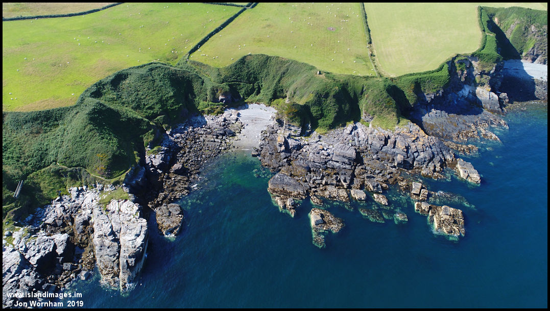 The little bay where the villagers of Maughold would have kept their fishing boats. At the back of the shore is an old winch for hauling the boats out. A green lane leads to the village.