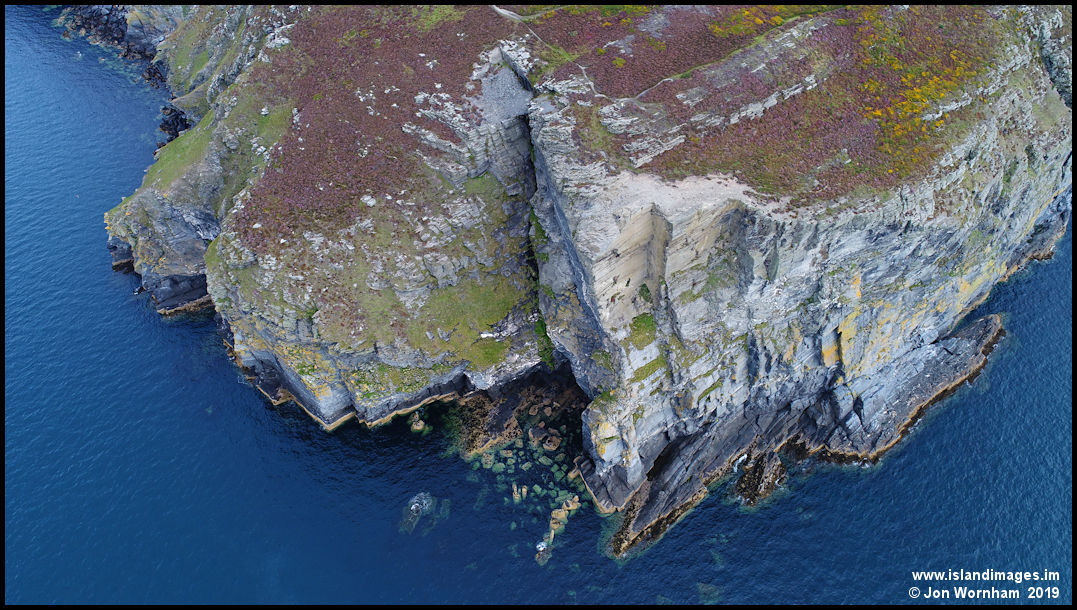 A near vertical view of Spanish Head, with another former slate quarry at top centre of the picture.