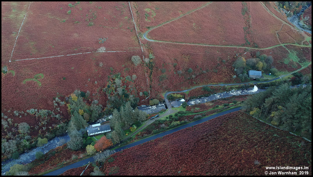 Looking down into the glen. The building on the right is the hydo electric generating station and the zig-zag track behind it leads up to Block Eary Reservoir.