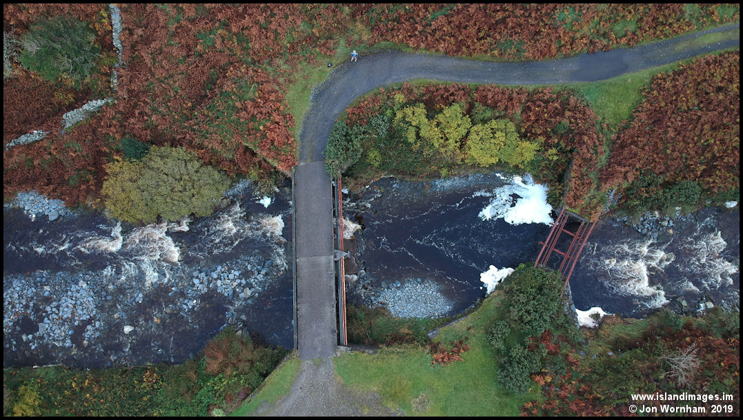 A vertical view of the old and new bridges across the Sulby River here. The hydo electric station is just out of shot to the right of the picture.