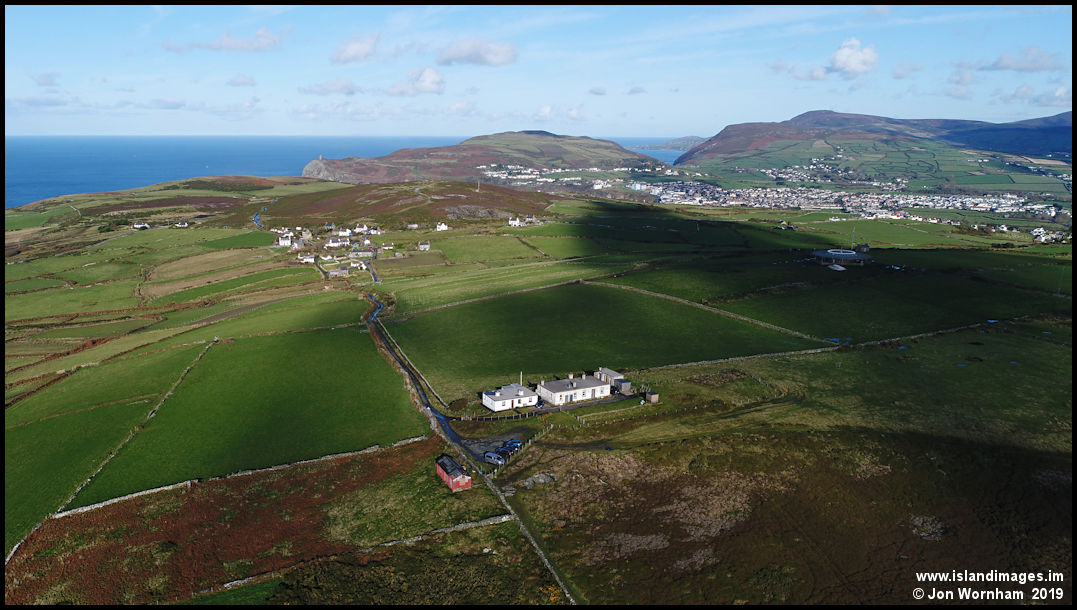 The former coastguard cottages with Cregneash and Port Erin behind.