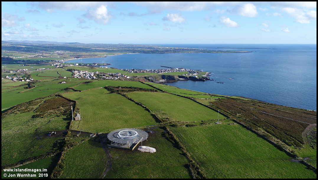 Looking past the 'space ship' as I've heard it called, towards Port St Mary. It is an aeronautical radio beacon providing services to overflying aircraft and aircraft inbound to and departing Ronaldsway.