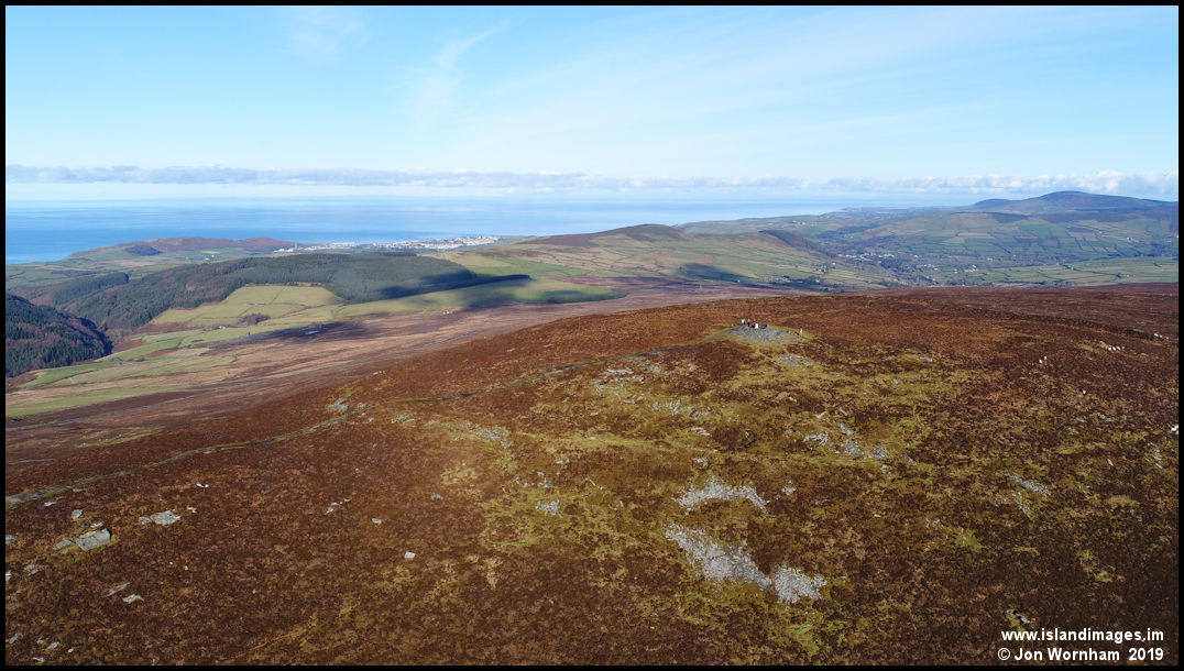 Looking across the summit of South Barrule with Peel in the distance. A party of walkers had just arrived and were enjoying the views of the island and across the sea to Ireland, Scotland, England and Wales.
