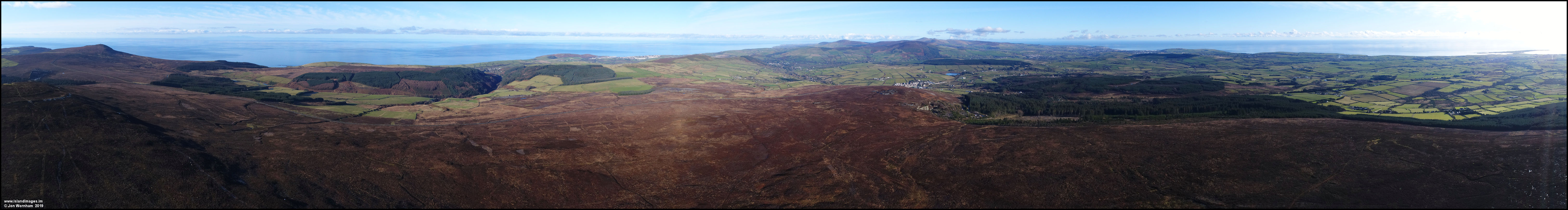 This panorama is from the eatern side of South Barrule, looking from Cronk-ny-Arrey-Laa on the left, past Niarbyl, Peel, Foxdale and Douglas, to Langness on the right.