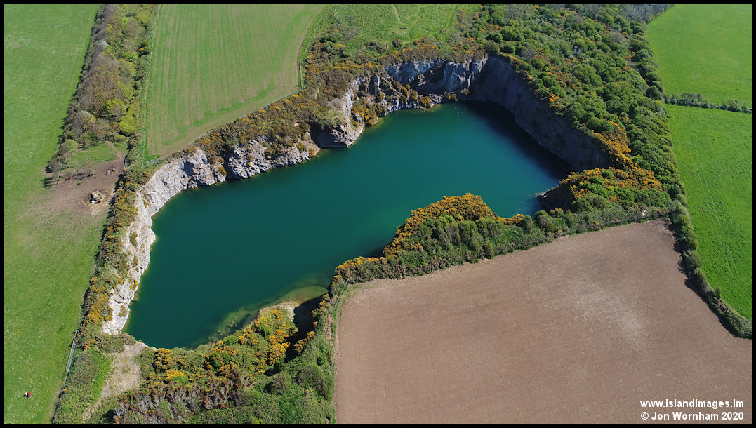 A near vertical view of the water filled quarry.