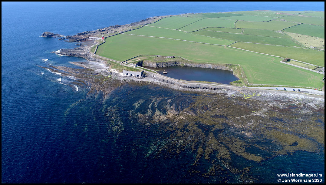 Looking down at the former quarry at Scarlett. Limestone from here was used for constructing many buildlings in Castletown, including Castle Rushen.