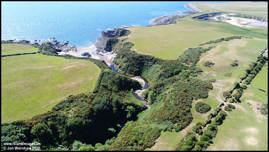 Looking down the Santon Gorge to the sea. The end of Ronaldsway's main runway can just be seen on the top right of the picture.
