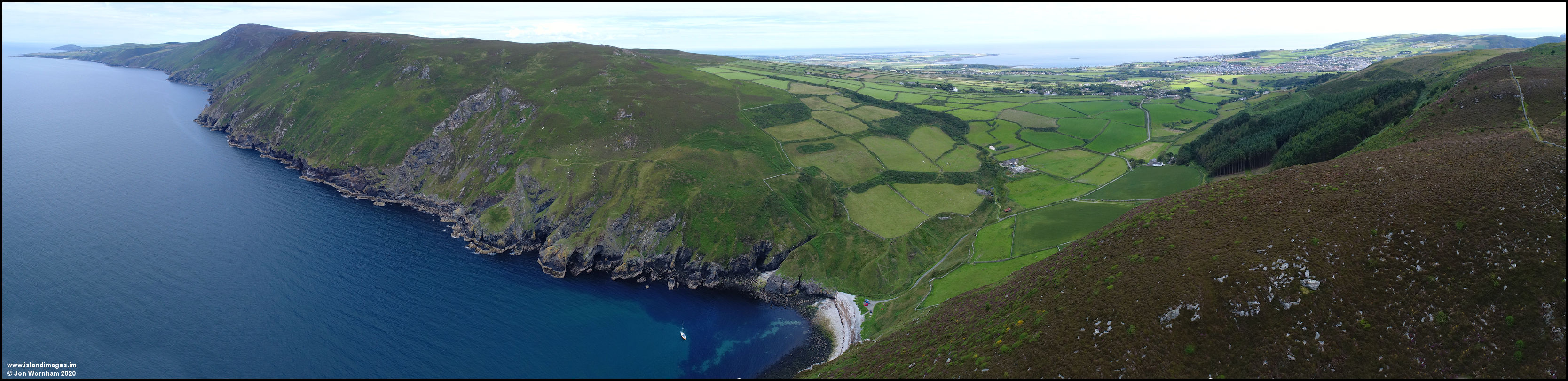 Panorama at Fleshwick from over the northern slopes of Bradda, Niarbyl and Peel Hill in the distance on the left.