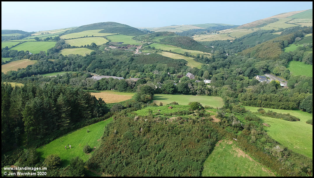 Moving the flying location to the top of the Aborteum, this shot is looking over the crest of the hill to Tynwald Mills and Glen Helen in the distance.