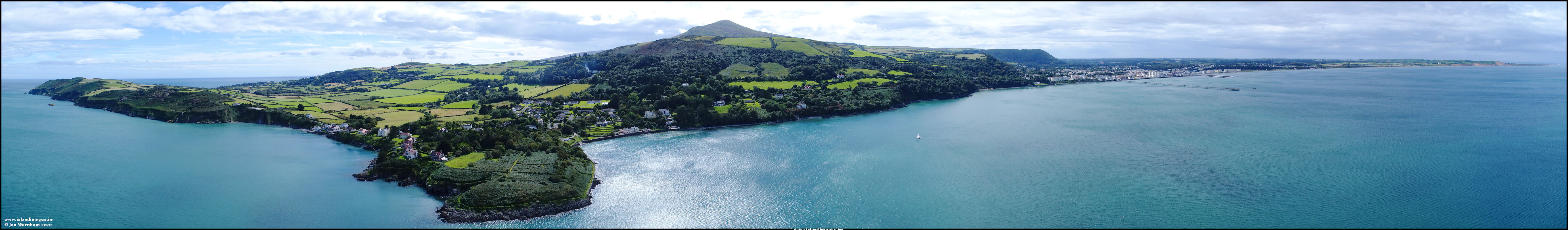Panorama centre on Gob-ny-Rona but looking from Maughold Head on the left and then past Ramsey to the Bride Cliffs and Point of Ayre on the right.
