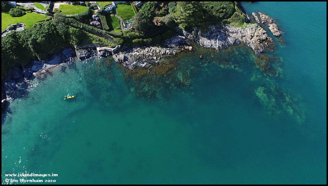 A near vertical view over the sea off Gob-ny-Rona with two kayaks on the clear waters.