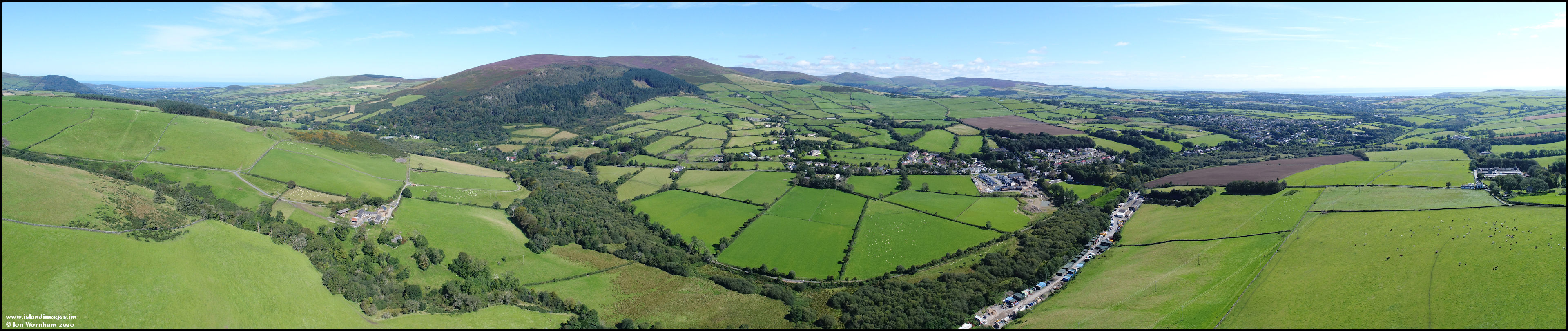 Panorama with Peel in the far disance on the left, then looking past Greeba, Crosby and Glen Vine. Ellerslie Farm and Marown Old Church just make it onto the far right of the picture.