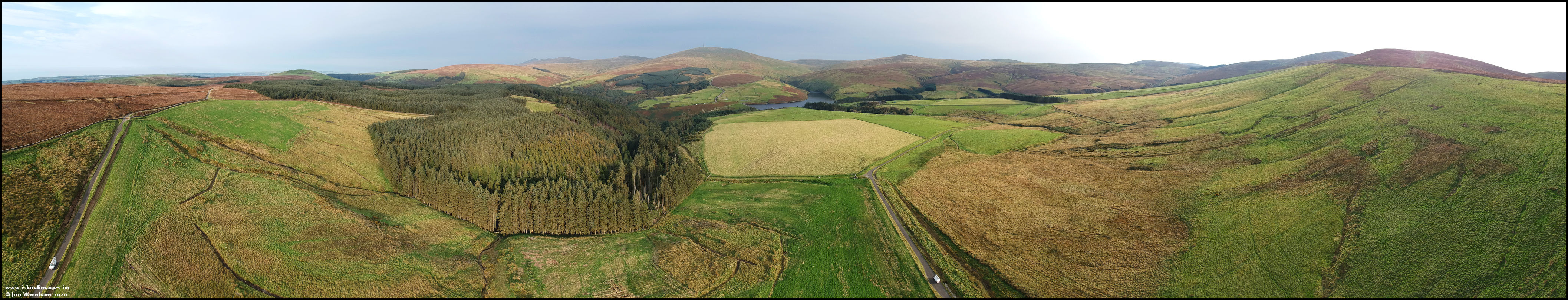 A similar view to the previous one, bu flying the drone closer to the plantation.  The Druidale road (and the same white van!) appears on both side of the panorama.