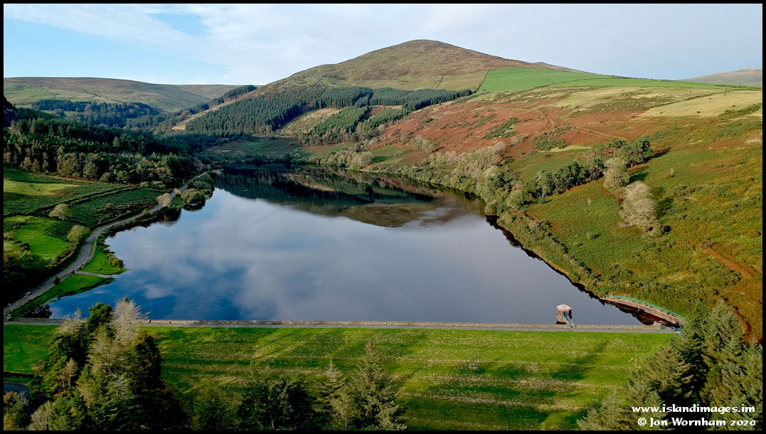 Flying even further back to take in the earth dam that contains the reservoir. Construction started in 1900 and a narrow gauge railway was constructed from the outskirts of Douglas to haul materials and workers to the site.