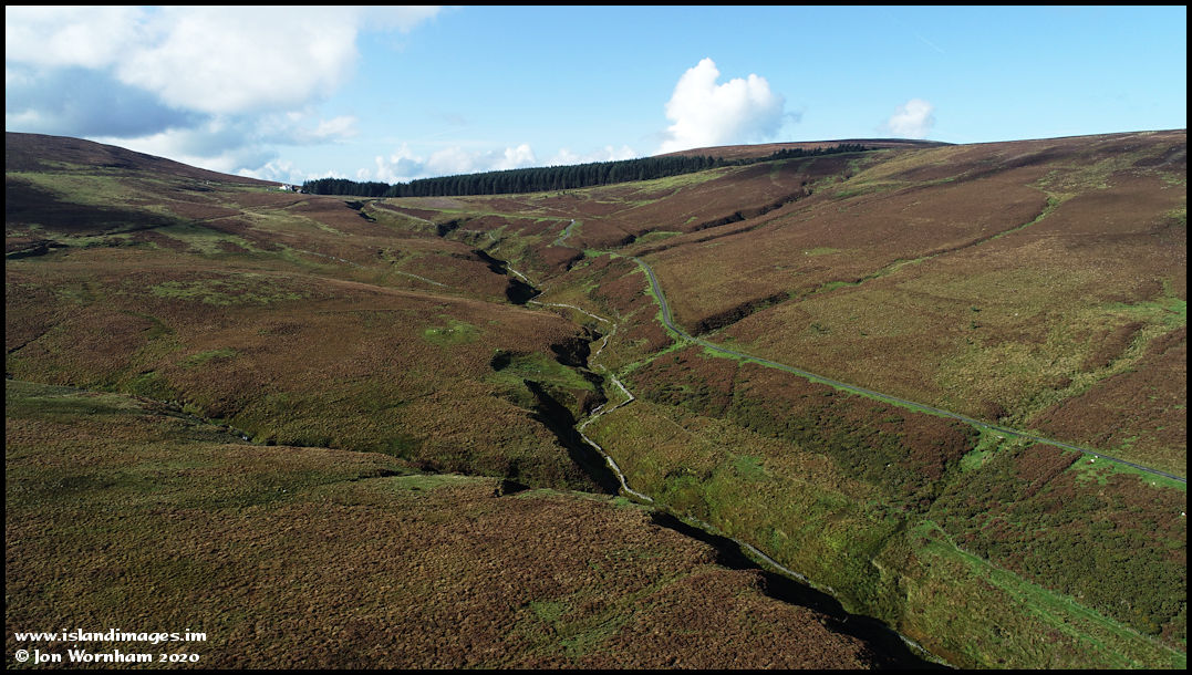 Looking to the south and up towards Brandywell Cottage. This area has remains of Iron Age roundhouses visible as green circles in the heather that otherwise covers the hillsides.